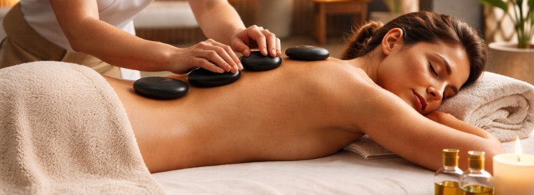 Le Massage Pierres Chaudes – Voyage Minéral procure une détente profonde et aide à relâcher les tensions musculaires grâce à la chaleur douce des pierres.